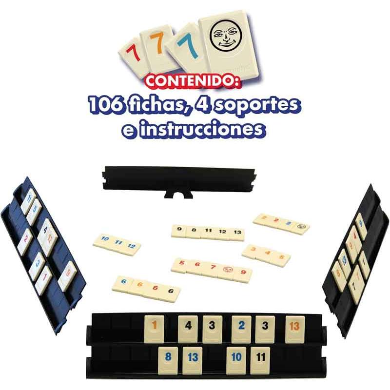 Incluye: 1 caja de almacenaje con diseño especial, 106 fichas de juego (8 conjuntos de fichas numeradas del 1-13 en 4 colores y 2 comodines), 4 soportes con patas e instrucciones de juego.