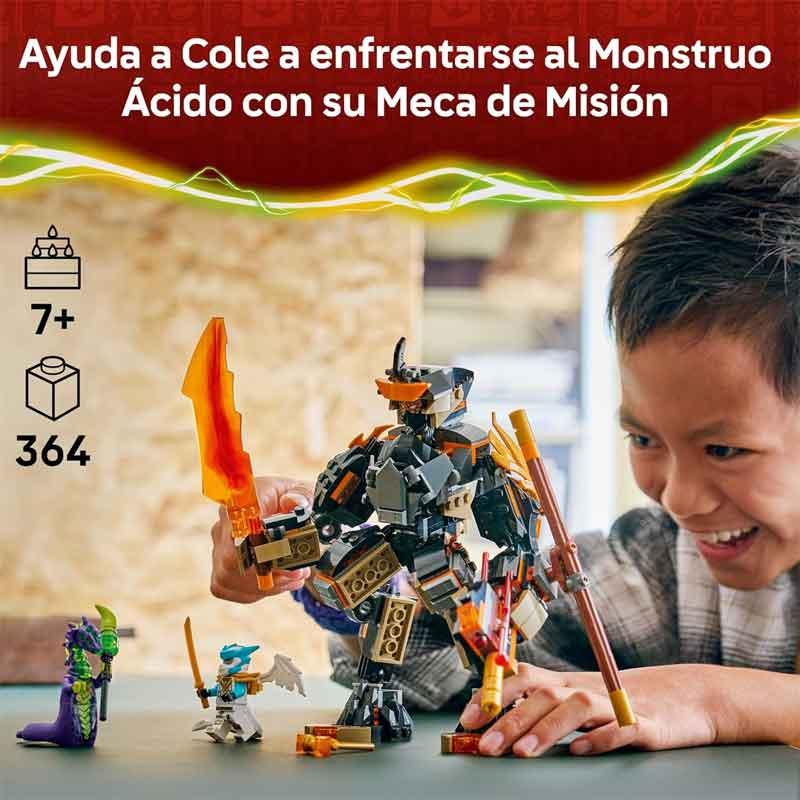 FIGURA ARTICULADA: El meca tiene cabeza, brazos, armadura para hombros, dedos, piernas y tobillos articulados, una cabina en el pecho para colocar a Cole y una mochila para guardar sus armas ninja.