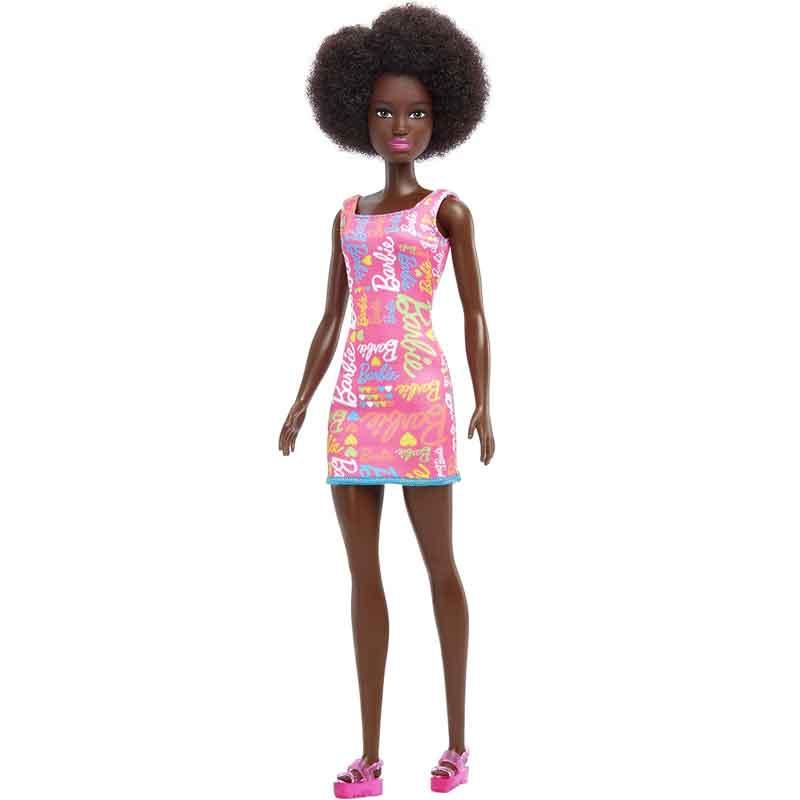 Muñeca Barbie afroamericana, vestido y sandalias con estampado de logotipo rosa