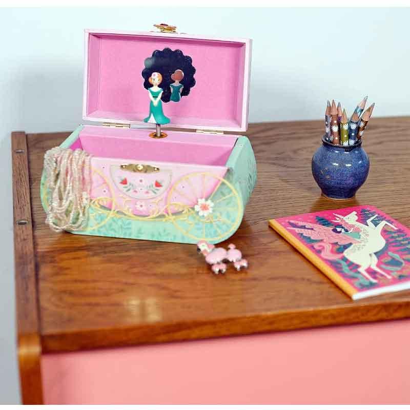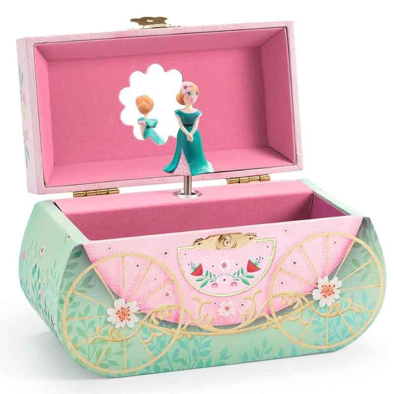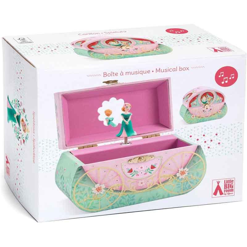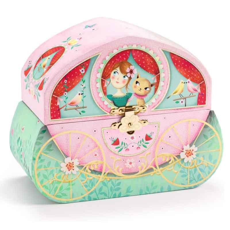 Una bonita caja de música de madera en forma de carroza para guardar tus tesoros y secretos de la colección Little Big Room de Djeco.