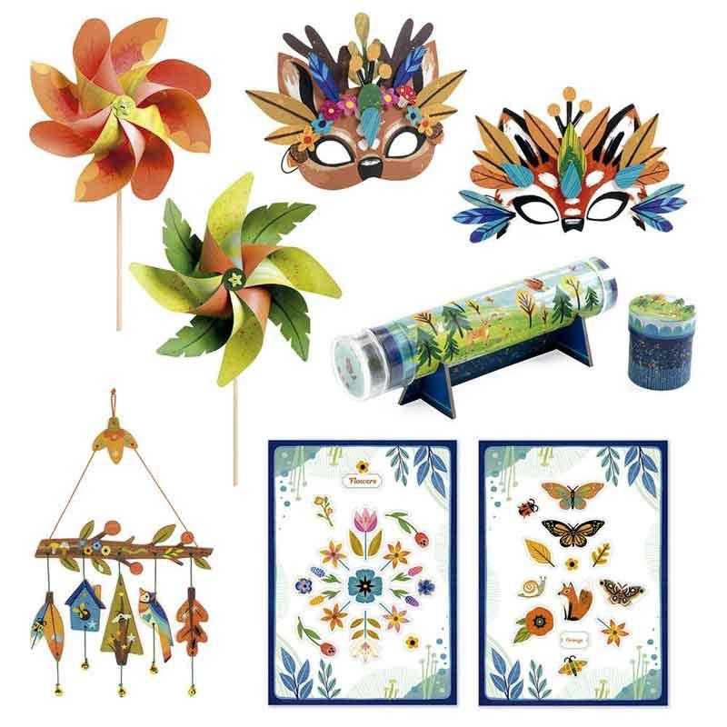 2 máscaras para decorar, 2 molinos de viento para construir,1 caleidoscopio para montar,6 láminas naturalistas para crear, 1 carrillón para personalizar.