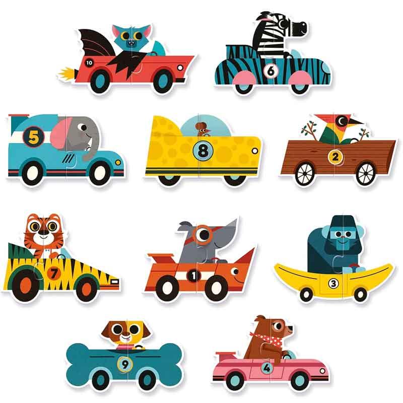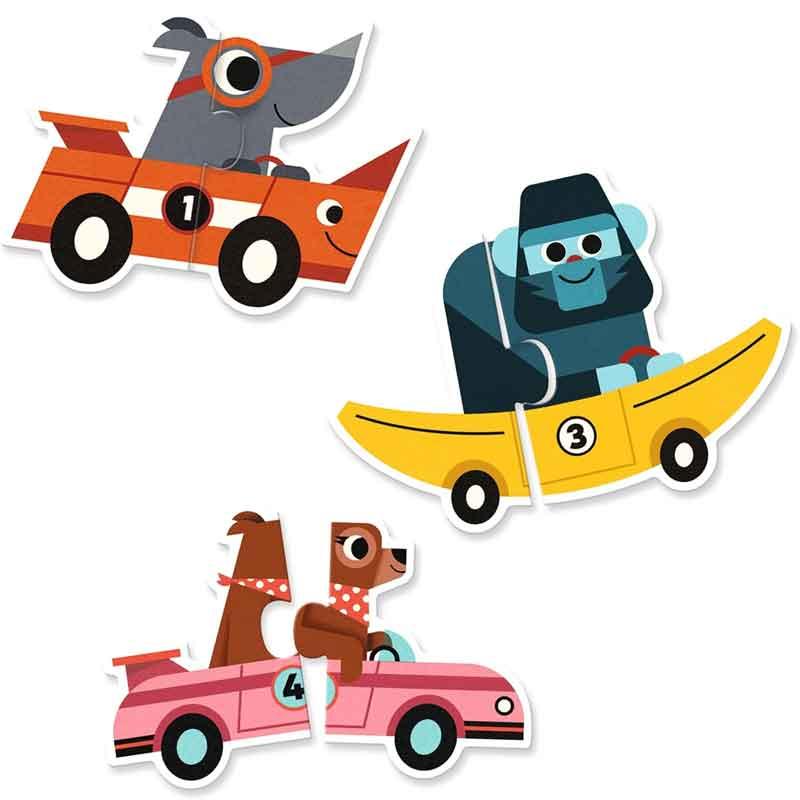 Un puzzle en el que el niño reconstruye 10 puzzles de 2 piezas de coches de carreras pilotados por simpáticos animales.