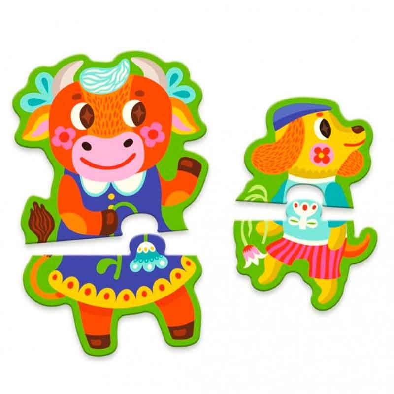 8 rompecabezas de 2 piezas en diferentes tamaños que forman 8 divertidos animales de granja.