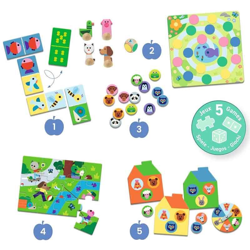 Un set completo que ofrece 5 juegos educativos esenciales: memoria, lotería, dominó, rompecabezas (12 piezas) y juego de mesa, perfecto para entretener a los niños mientras desarrollan su lógica, memoria y habilidades de observación.