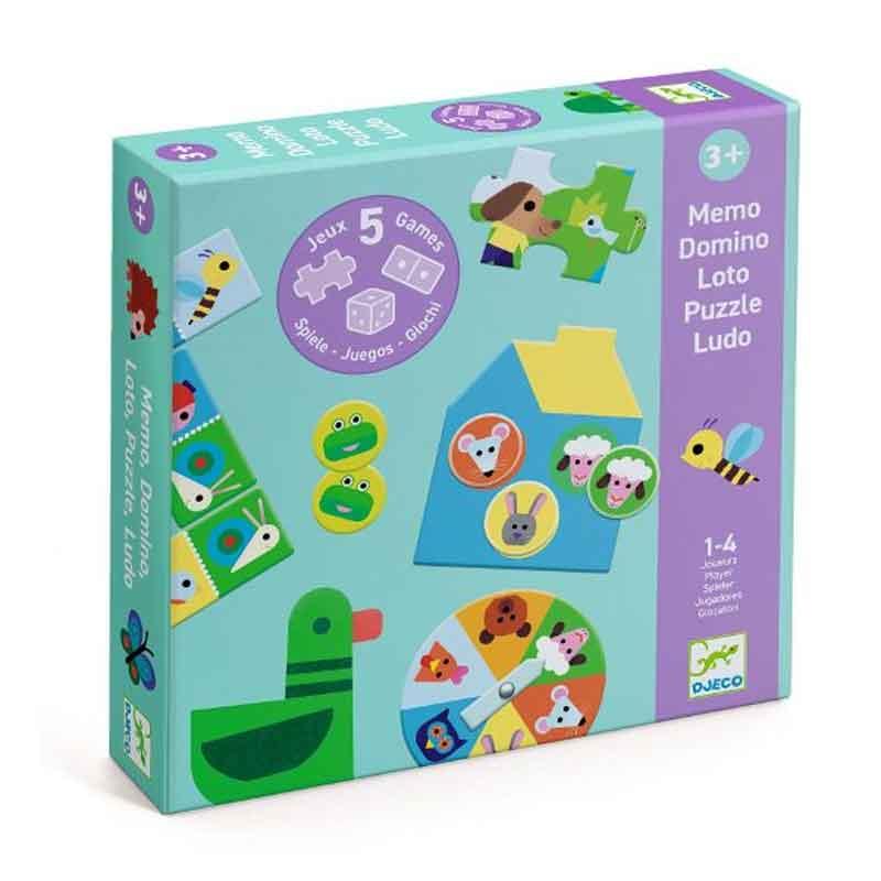 Un completo cofre con 5 juegos educativos imprescindibles: un juego de memoria, un bingo, un dominó, un puzzle (12 piezas) y un juego de recorrido, ideales para que los niños se diviertan mientras desarrollan su lógica, memoria y sentido de la observación.