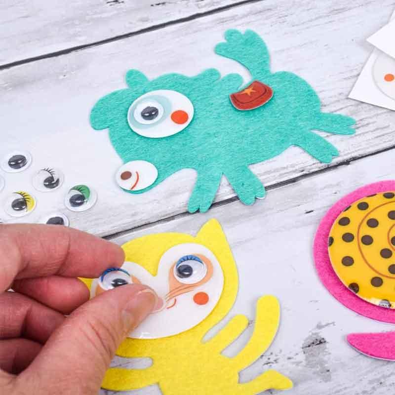 Este kit te invita a dar vida a adorables siluetas de animales de fieltro, decorándolas con divertidas pegatinas de ojos, caras y otros detalles.