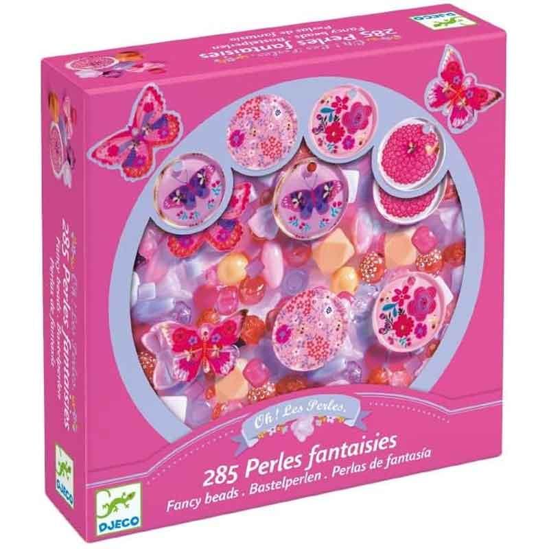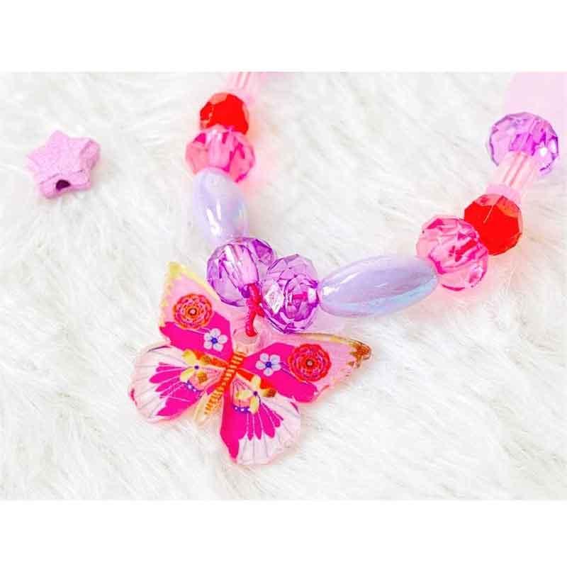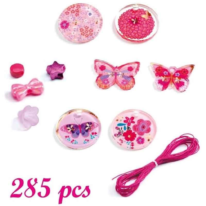 Un cofre que contiene 285 cuentas acrílicas y 6 colgantes de mariposas para crear hermosas piezas de bisutería.