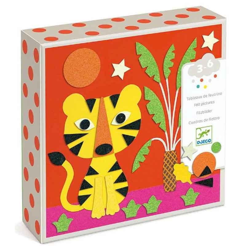 Una manualidad infantil de collage para hacer 4 cuadros con pegatinas de fieltro blando. Siguiendo el folleto explicativo, el niño ensambla y superpone las pegatinas de fieltro para hacer 4 suaves y coloridos dibujos de "animales".