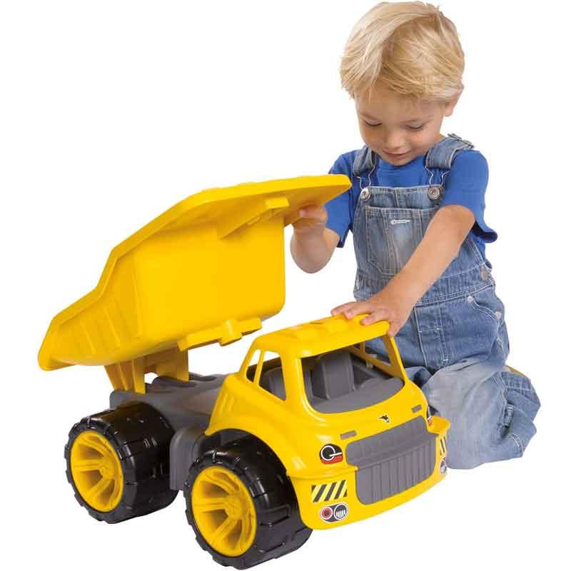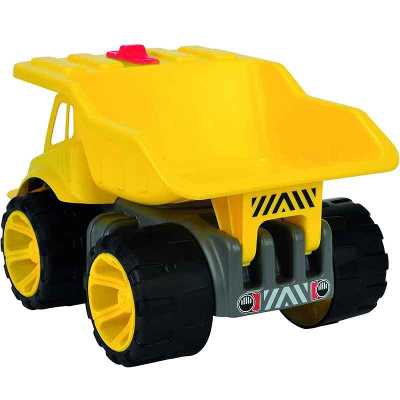 Su diseño en amarillo brillante hace que se parezca a los originales y está especialmente adaptado a la ergonomía de los más pequeños para que puedan empujar el camión, transportarlo o vaciar el área de carga fácilmente.