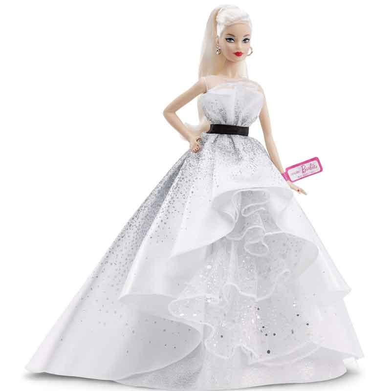 Aniversario de diamante : Para conmemorar su aniversario de diamante, la muñeca Barbie 60 aniversario lleva un vestido de gala de princesa con adornos plateados. Su look se completa con unos zapatos negros abiertos por delante y unos pendientes de aro dorados. La muñeca Barbie 60 aniversario rinde homenaje a la Barbie original con sus emblemáticos detalles, como su elegante coleta rizada, sus labios rojos y su enigmática mirada a un lado.V
