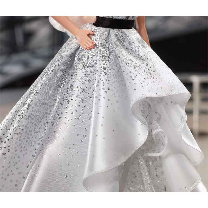 Para celebrar su aniversario de diamante, Barbie 60 aniversario, lleva un vestido que brilla con detalles plateados e inspirados en los diamantes.