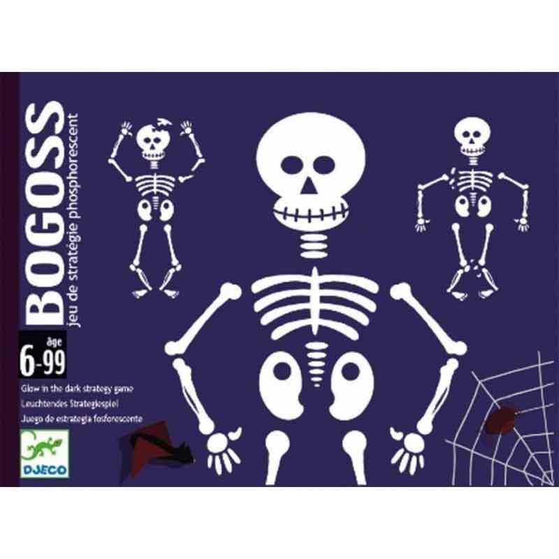 Encontrar las 6 partes de un esqueleto, ¡Que desafío tan divertido!...pero atención a los huesos rotos...¡Un juego de intercambio de cartas fosforescentes para jugar también en la oscuridad!