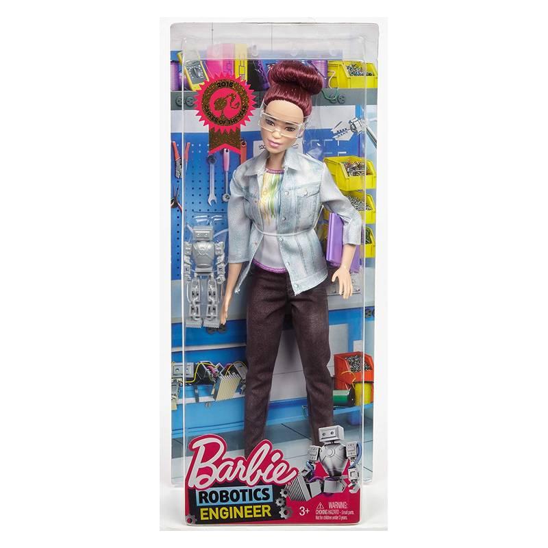 Barbie Ingeniera Robótica con pelo de color caoba y un look casual, equipada con accesorios para trabajar.